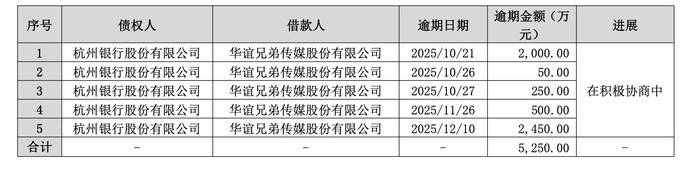 据华谊兄弟公告,公司因部分回款资金未能如约到位,造成暂时性流动资金紧张,使得公司阶段性出现个别债务未能如期偿还。债务逾期共计5250万元,超过公司2024年经审计净资产的10%。逾期债务金额虽未达亿级,但其占2024年净资产比例已触发警示线。更值得关注的是,公司部分银行账户已被司法冻结,涉及账户达13个,部分账户余额为零。